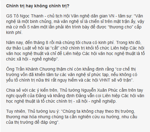 Nhưng có thể khẳng định Đảng, Nhà nước luôn chăm lo, quan tâm phát triển VHNT. Đường lối, chính sách đã rõ ràng nhưng trong thực hiện thì có vấn đề cụ thể còn những bất cập.