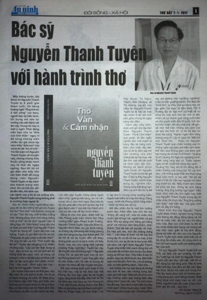 Đang lúc Nguyễn Thanh Tuyên phải gồng mình chống chọi với căn bênh K phổi quái ác tại khoa U biếu Bệnh viện Hữu nghị Việt - Tiệp thì Báo ANHP đã ra số 4038, thứ 7 ngày 7 tháng 1 năm 2017 với bài: "Bác sỹ Nguyễn Thanh Tuyên với hành trình thơ" của Ngọc Tô để động viên tinh thần cho thi nhân, người thày thuốc hết lòng vì sức khỏe của cộng đồng. Đây là tờ báo phục vụ nhiều đối tượng của miền duyên hải, đặc biệt là tầng lớp lao động với số lượng phát hành khá lớn, trên 1 vạn bản.