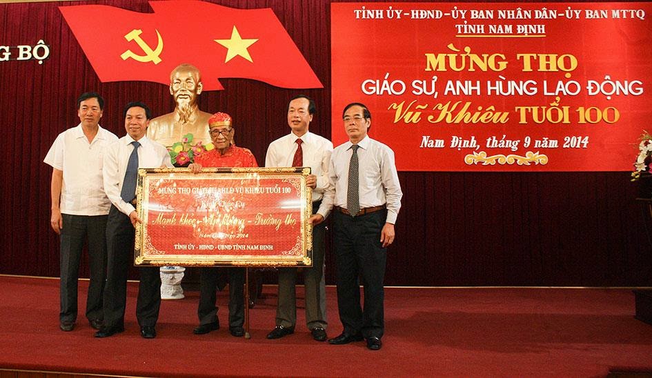 TTTĐ - Sáng 18/9, Thành ủy, HĐND – UBND, UB MTTQ Thành phố Hà Nội tổ chức chúc thọ Giáo sư (GS), Anh hùng Lao động, Công dân Thủ đô ưu tú Vũ Khiêu tròn 100 tuổi. Bí thư Thành ủy Phạm Quang Nghị, Chủ tịch UBND TP Nguyễn Thế Thảo, Phó Bí thư Thường trực Thành ủy Ngô Thị Thanh Hằng, Chủ tịch HĐND TP Nguyễn Thị Bích Ngọc cùng các đồng chí lãnh đạo các sở, ngành TP đã tới dự.