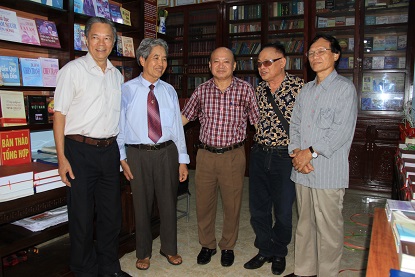 Từ phái sang là Hà Cừ, Kim Chuông, Tô Ngọc Thạch, Minh Chuyên, Đinh Quang Tốn tại Nhà bảo tàng Minh Chuyên.