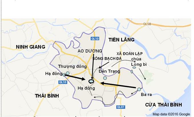Câu sấm lưu truyền lại về Ao Dương mọi người đều biết, nhà sử học Hải Phòng Ngô Đăng Lợi cũng đã từng nghiên cứu câu sấm này: “Ba Ra trông sang, ba đồng ngoảnh lại, táng tại Ao Dương”. Ba Ra là cống Ba Ra gần ngã ba tiếp giáp sông Hóa và sông Thái Bình, thuộc xã Trấn Dương. Ba đồng theo ông Ngô Đăng Lợi nghĩ đó là cống Ba Đồng thuộc xã Trung lập.