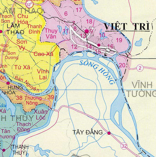 Bản đồ sông Hồng ngày nay qua thành phố Việt Trì. Khúc ghi Sông Hồng là sông Phú Nông thời xưa