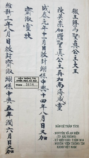 Từ đó ta có thể khảng định hai sắc phong đầu chỉ là tương truyền mà thôi. Còn các sắc phong thời nhà Nguyễn (1889 – 1924) là có cơ sởBẢN KÊ THẦN TÍCH CỦA LÀNG AN BIÊN – TP. HẢI PHÒNG